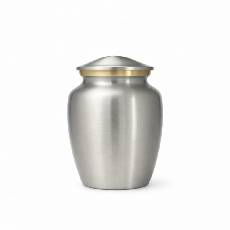 Esta ánfora ha sido elaborada en aluminio liviano y resistente, combinando con elegancia y durabilidad. Su tonalidad plateada aporta un estilo sofisticado y clásico, mientras que en el borde superior cuenta con un detalle en tono dorado que le otorga un contraste delicado y refinado, su diseño versátil la convierte en una pieza perfecta para espacios conmemorativos.