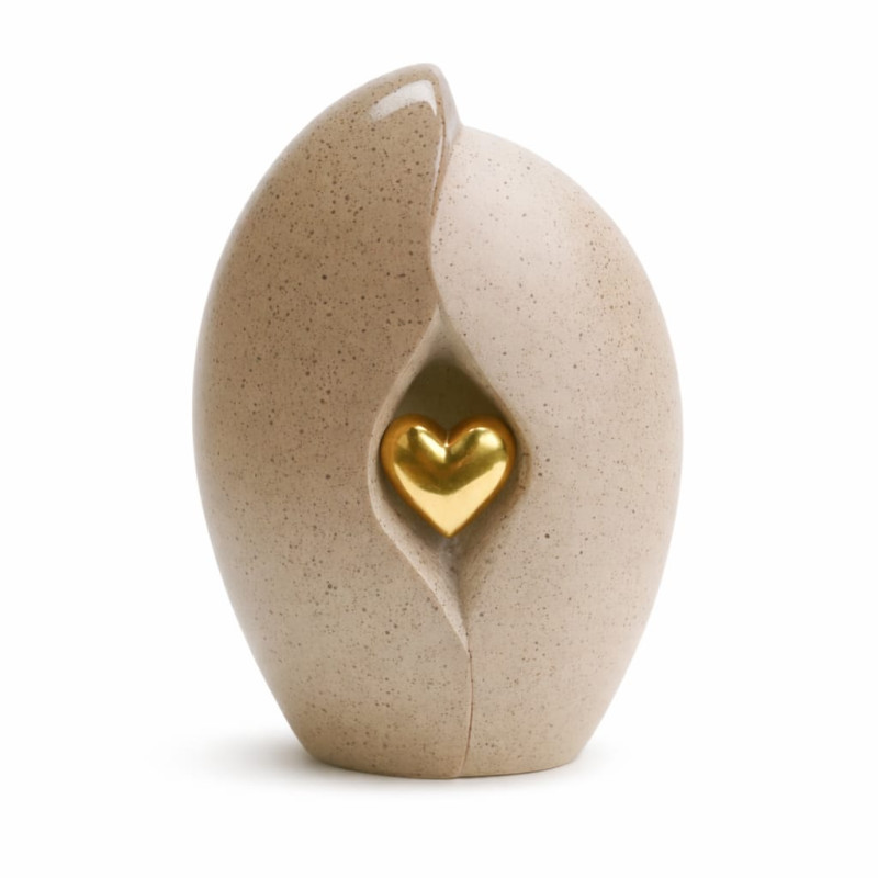 Ánfora de aluminio con un delicado acabado en tono arena, en el centro destaca un elegante corazón dorado. Su diseño armonioso y sobrio la convierte en una pieza conmemorativa perfecta.